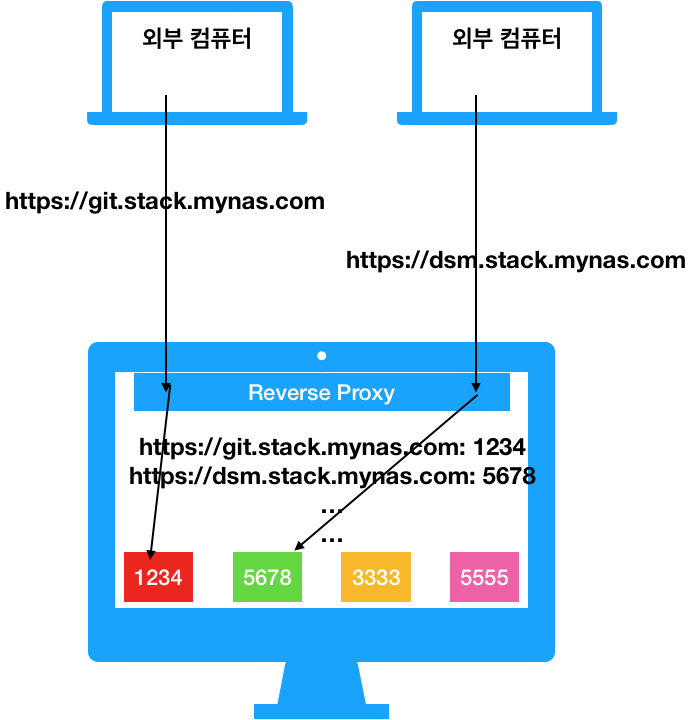 아래와 같이 외부로는 https로 NAS의 서브도메인을 노출하고, 외부에서 해당 서브도메인에 접근할 때 reverse proxy에서 내부 port로 연결시켜주면 된다.
